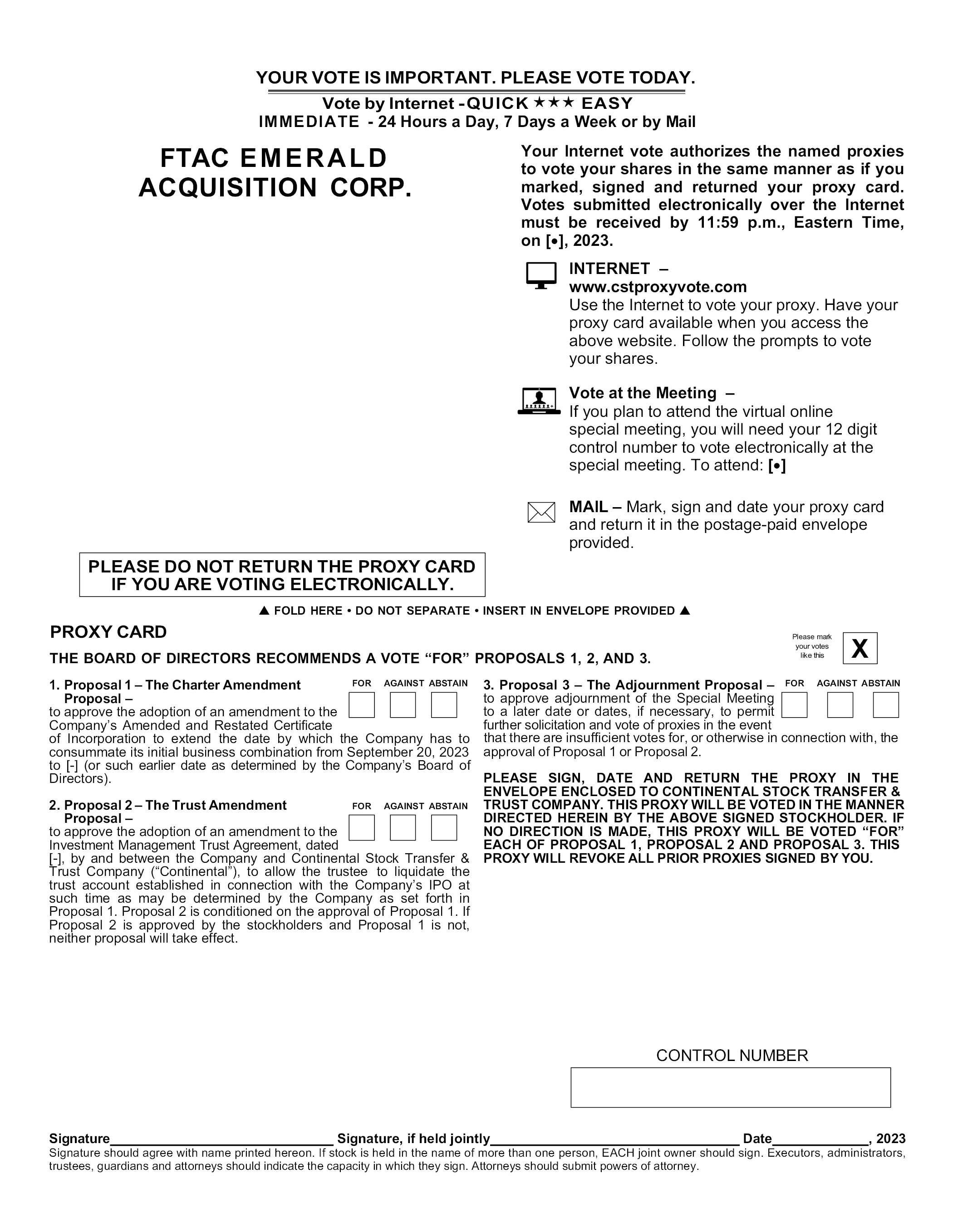 YOUR VOTE IS IMPORTANT. PLEASE VOTE TODAY. Vote by Internet - QUICK EASY IMMEDIATE - 24 Hours a Day, 7 Days a Week or by Mail FTAC EMERALD ACQUISITION CORP. Your Internet vote authorizes the named proxies to vote your shares in the same manner as if you marked, signed and returned your proxy card. Votes submitted electronically over the Internet must be received by 11:59 p.m., Eastern Time, on [-], 2023. INTERNET – www.cstproxyvote.com Use the Internet to vote your proxy. Have your proxy card available when you access the above website. Follow the prompts to vote your shares. Vote at the Meeting – If you plan to attend the virtual online special meeting, you will need your 12 digit control number to vote electronically at the special meeting. To attend: [-] MAIL – Mark, sign and date your proxy card and return it in the postage-paid envelope provided. PROXY CARD FOLD HERE DO NOT SEPARATE INSERT IN ENVELOPE PROVIDED Please mark THE BOARD OF DIRECTORS RECOMMENDS A VOTE “FOR” PROPOSALS 1, 2, AND 3. your votes like this 1. Proposal 1 – The Charter Amendment Proposal – to approve the adoption of an amendment to the Company’s Amended and Restated Certificate FOR AGAINST ABSTAIN 3. Proposal 3 – The Adjournment Proposal – to approve adjournment of the Special Meeting to a later date or dates, if necessary, to permit further solicitation and vote of proxies in the event FOR AGAINST ABSTAIN of Incorporation to extend the date by which the Company has to consummate its initial business combination from September 20, 2023 to [-] (or such earlier date as determined by the Company’s Board of Directors). that there are insufficient votes for, or otherwise in connection with, the approval of Proposal 1 or Proposal 2. PLEASE SIGN, DATE AND RETURN THE PROXY IN THE ENVELOPE ENCLOSED TO CONTINENTAL STOCK TRANSFER & 2. Proposal 2 – The Trust Amendment Proposal – to approve the adoption of an amendment to the Investment Management Trust Agreement, dated FOR AGAINST ABSTAIN TRUST COMPANY. THIS PROXY WILL BE VOTED IN THE MANNER DIRECTED HEREIN BY THE ABOVE SIGNED STOCKHOLDER. IF NO DIRECTION IS MADE, THIS PROXY WILL BE VOTED “FOR” EACH OF PROPOSAL 1, PROPOSAL 2 AND PROPOSAL 3. THIS [-], by and between the Company and Continental Stock Transfer & Trust Company (“Continental”), to allow the trustee to liquidate the trust account established in connection with the Company’s IPO at such time as may be determined by the Company as set forth in Proposal 1. Proposal 2 is conditioned on the approval of Proposal 1. If Proposal 2 is approved by the stockholders and Proposal 1 is not, neither proposal will take effect. PROXY WILL REVOKE ALL PRIOR PROXIES SIGNED BY YOU. CONTROL NUMBER Signature Signature, if held jointly Date, 2023 Signature should agree with name printed hereon. If stock is held in the name of more than one person, EACH joint owner shou ld sign. Executors, administrators, trustees, guardians and attorneys should indicate the capacity in which they sign. Attorneys should submit powers of attorney .