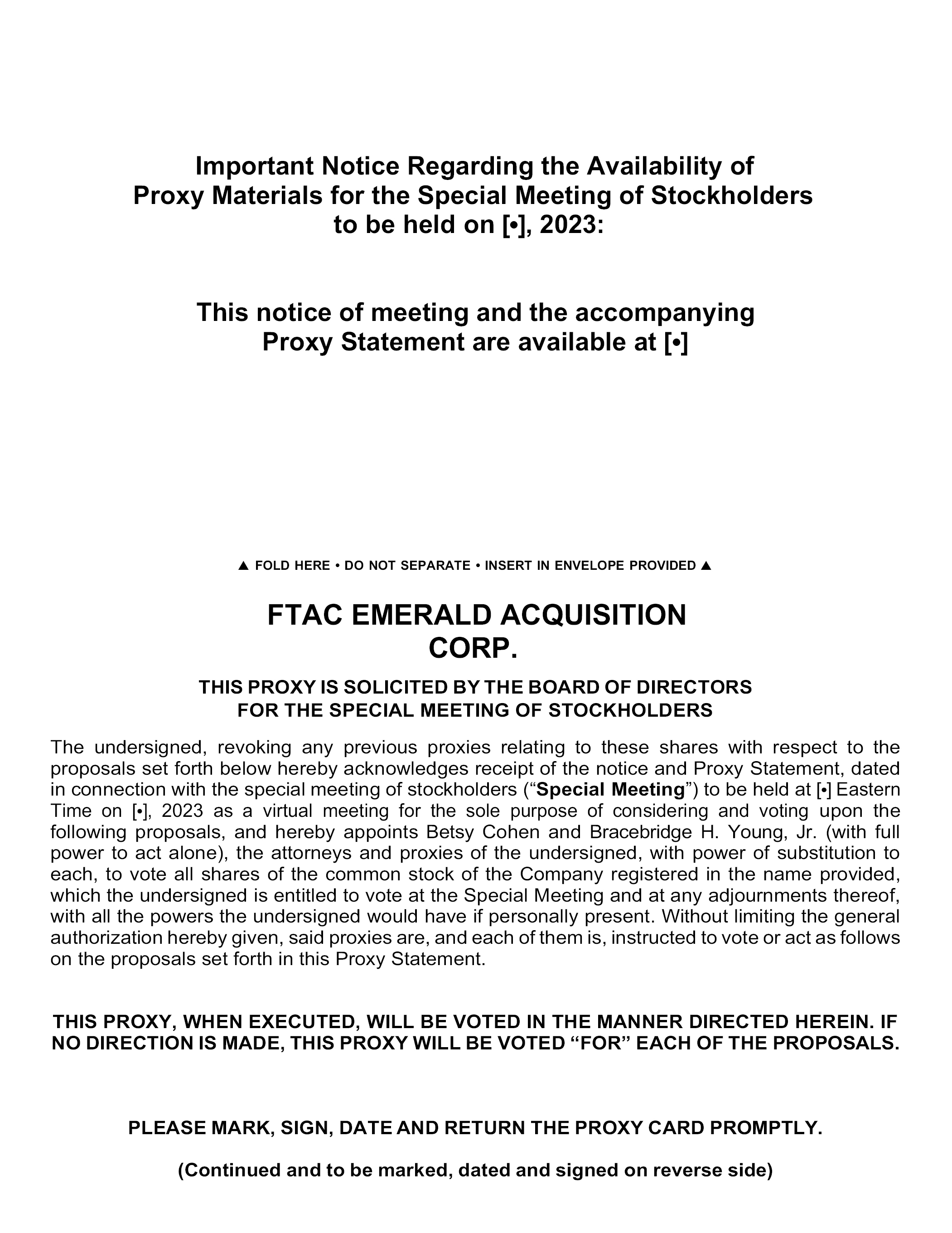 Important Notice Regarding the Availability of Proxy Materials for the Special Meeting of Stockholders to be held on [-], 2023: This notice of meeting and the accompanying Proxy Statement are available at [-] FOLD HERE DO NOT SEPARATE INSERT IN ENVELOPE PROVIDED FTAC EMERALD ACQUISITION CORP. THIS PROXY IS SOLICITED BY THE BOARD OF DIRECTORS FOR THE SPECIAL MEETING OF STOCKHOLDERS The undersigned, revoking any previous proxies relating to these shares with respect to the proposals set forth below hereby acknowledges receipt of the notice and Proxy Statement, dated in connection with the special meeting of stockholders (“Special Meeting”) to be held at [-] Eastern Time on [-], 2023 as a virtual meeting for the sole purpose of considering and voting upon the following proposals, and hereby appoints Betsy Cohen and Bracebridge H. Young, Jr. (with full power to act alone), the attorneys and proxies of the undersigned, with power of substitution to each, to vote all shares of the common stock of the Company registered in the name provided, which the undersigned is entitled to vote at the Special Meeting and at any adjournments thereof, with all the powers the undersigned would have if personally present. Without limiting the general authorization hereby given, said proxies are, and each of them is, instructed to vote or act as follows on the proposals set forth in this Proxy Statement. THIS PROXY, WHEN EXECUTED, WILL BE VOTED IN THE MANNER DIRECTED HEREIN. IF NO DIRECTION IS MADE, THIS PROXY WILL BE VOTED “FOR” EACH OF THE PROPOSALS. PLEASE MARK, SIGN, DATE AND RETURN THE PROXY CARD PROMPTLY. (Continued and to be marked, dated and signed on reverse side)